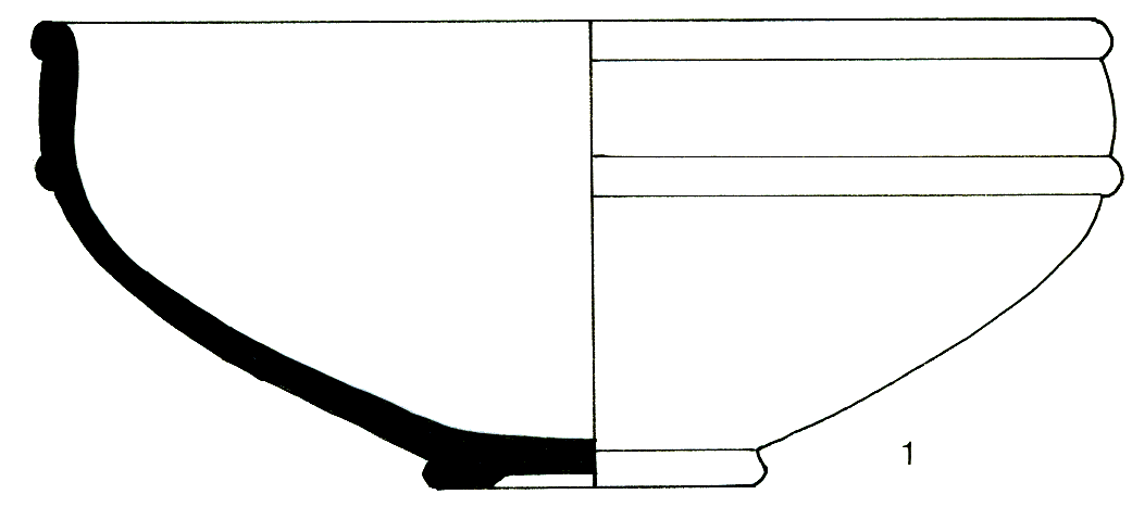 Terrine de forme hémisphérique ; rebord en rouleau, lèvre ronde ; base annulaire ; céramique tournée, pâte de couleur grise, noire en surface ; inclusions grossières: quartz irrégulier en proportion moyenne,mica ; surface lissée. Baguette sur la panse.