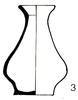 Flacon de forme piriforme ; encolure rentrante, concave, rebord incliné vers l'extérieur, lèvre ronde ; base étirée puis élargie, assise plane ; céramique tournée, couleur grise en surface et sur les cassures ; inclusions moyennes: quartz ; surface brute.