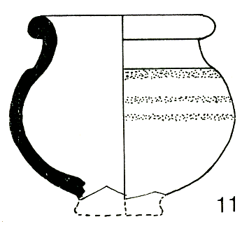 céramique tournée ; inclusions trés grossières: quartz irrégulier en proportion moyenne, mica ; surface brute.